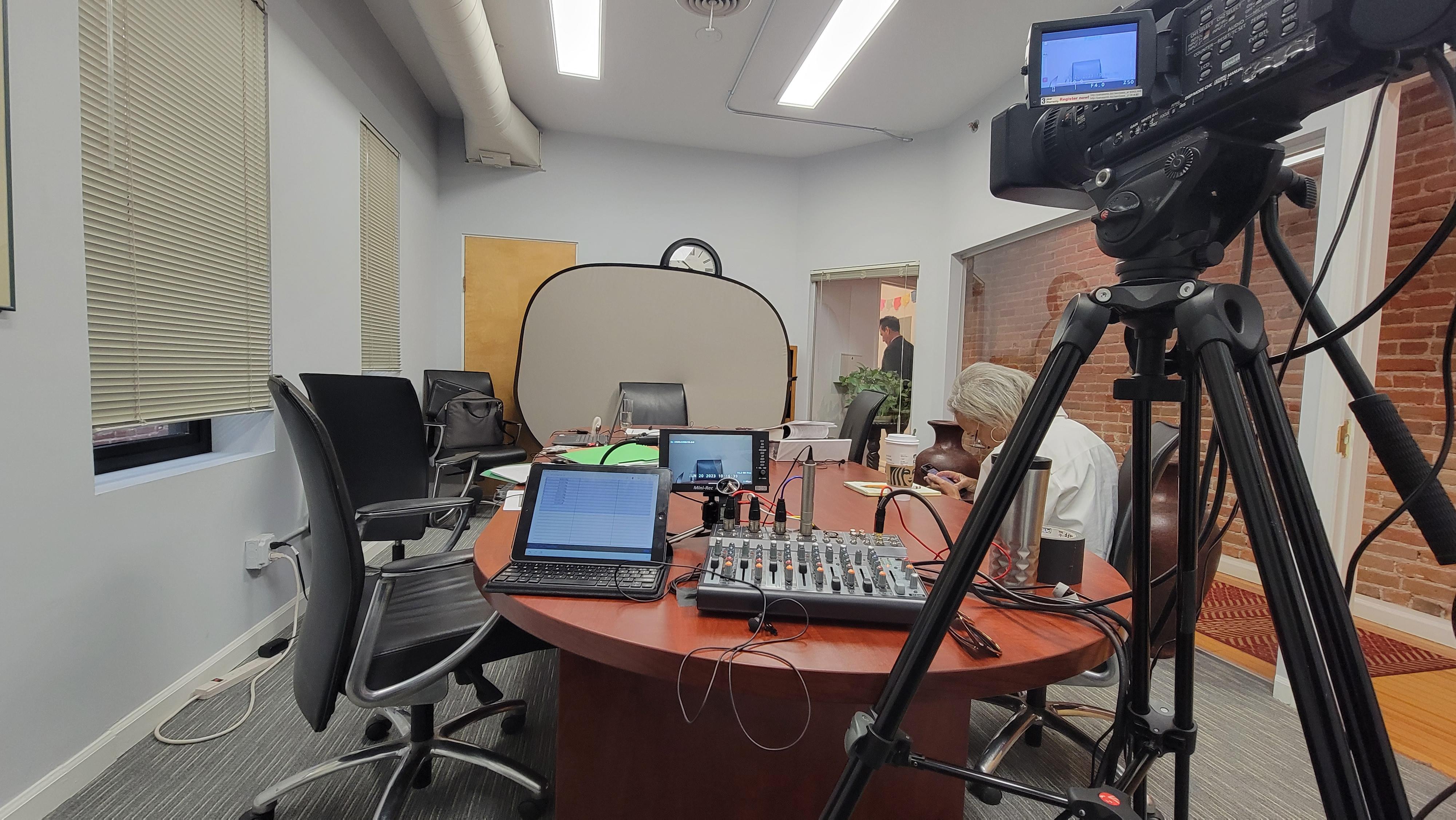 Our of our legal video rigs feature a camera capable of up to 1080p, tripod, neutral backdrop & stand, 4 wired lavalier microphones, an omni table mic, XLR cabling, audio mixer & a headphone with accessories to supply an audio signal to the court reporter as well as a pair of earbuds for both the videographer & the court reporter.